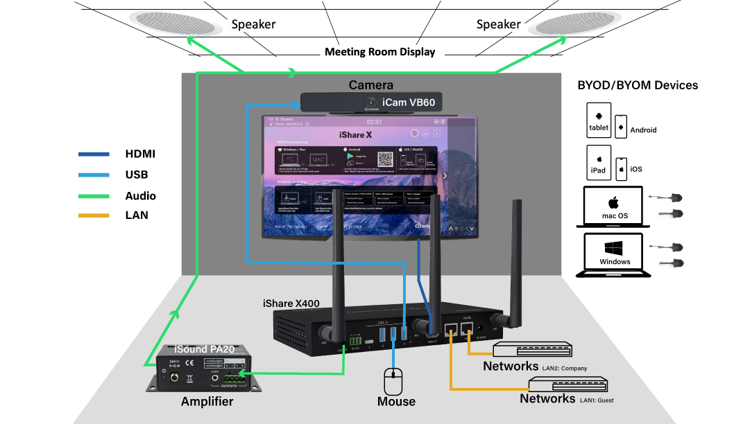 El iShare X ofrece conferencias inalámbricas de un solo toque sin problemas. Con nuestro sistema de sala inalámbrico agnóstico, usted inicia una reunión híbrida desde su computadora portátil, utilizando cualquier software de conferencia para disfrutar de sus experiencias perfectas de Traiga su propia reunión (BYOM). Entre, conéctese automáticamente a los dispositivos de la habitación como cámaras, micrófonos, parlantes, barras de sonido.